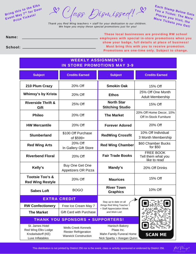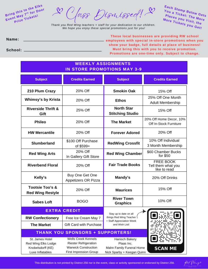 Check out the Promotions Report Card and full list of sponsors and supporters for Red Wing teacher and staff-exclusive promotions from local Red Wing businesses. Whether it’s coffee, meals or shopping discounts, our community is showing up BIG to say thank you to our educators.
